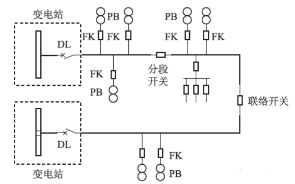 如下圖所示,其作為現(xiàn)階段典型的配電系統(tǒng)拓?fù)鋱D,變電站的10kV出線配置斷路器和對(duì)應(yīng)保護(hù),主線路中引用開(kāi)關(guān)分段,各分支線路結(jié)合負(fù)荷開(kāi)關(guān)的方式進(jìn)行配置,且全部開(kāi)關(guān)都具有合閘等功能。因?yàn)榉侄伍_(kāi)關(guān)與負(fù)荷開(kāi)關(guān)在運(yùn)行期間,難以斷開(kāi)短路電流,所以不需要安裝保護(hù)設(shè)施。其中,圖中的DL屬于斷路器,FK屬于負(fù)荷開(kāi)關(guān),而PB是配變。