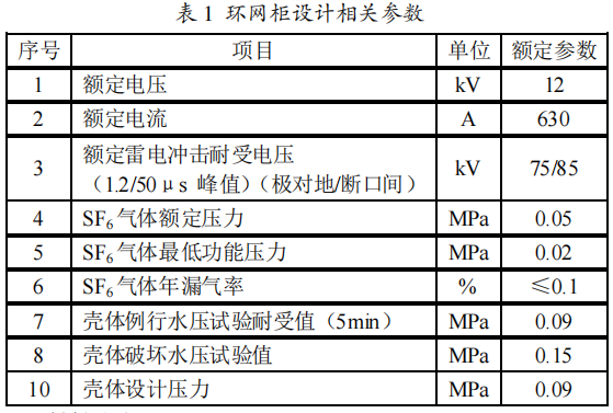 環(huán)網(wǎng)柜殼體形狀不同有箱式和筒式之分。由于箱式結(jié)構(gòu)有利于實(shí)現(xiàn)進(jìn)出線.配電方案的實(shí)施,但是箱式在承受壓力的局限性,使箱體不能夠承受太高的壓力。下面介紹一種環(huán)網(wǎng)柜氣箱的設(shè)計(jì)方法。與氣箱設(shè)計(jì)有關(guān)的環(huán)網(wǎng)柜額定參數(shù)見表1。