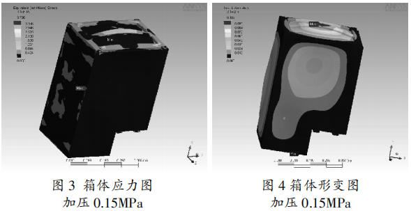 箱壁厚度滿足材料的許應(yīng)應(yīng)力要求及氣箱允許變形量要求。通過軟件分析計(jì)算后得到氣箱的應(yīng)力分布(見圖3)及箱體形變(見圖4),最終找到氣箱壁厚。