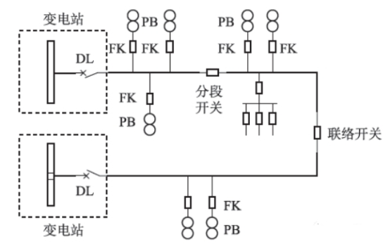 如下圖所示,其作為現階段典型的配電體系拓撲圖,變電站的10kV出線裝備斷路器和對應維護,主線路中引證開關分段,各分支線路結合負荷開關的方法進行裝備,且全部開關都具有合閘等功用。由于分段開關與負荷開關在作業期間,難以斷開短路電流,所以不需求設備維護設施。其間,圖中的DL歸于斷路器,FK歸于負荷開關,而PB是配變。