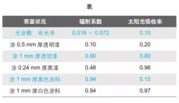 下表給出了金屬表面輻射系數(shù)8與太陽光的吸收率示例。